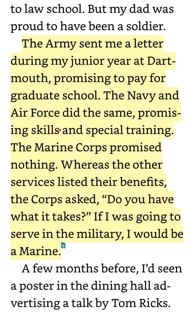 From Nathaniel Fick’s One Bullet Away, and a reminder that incentives function in all kinds of ways. Yes, incentives are financial but that’s just part of the whole.