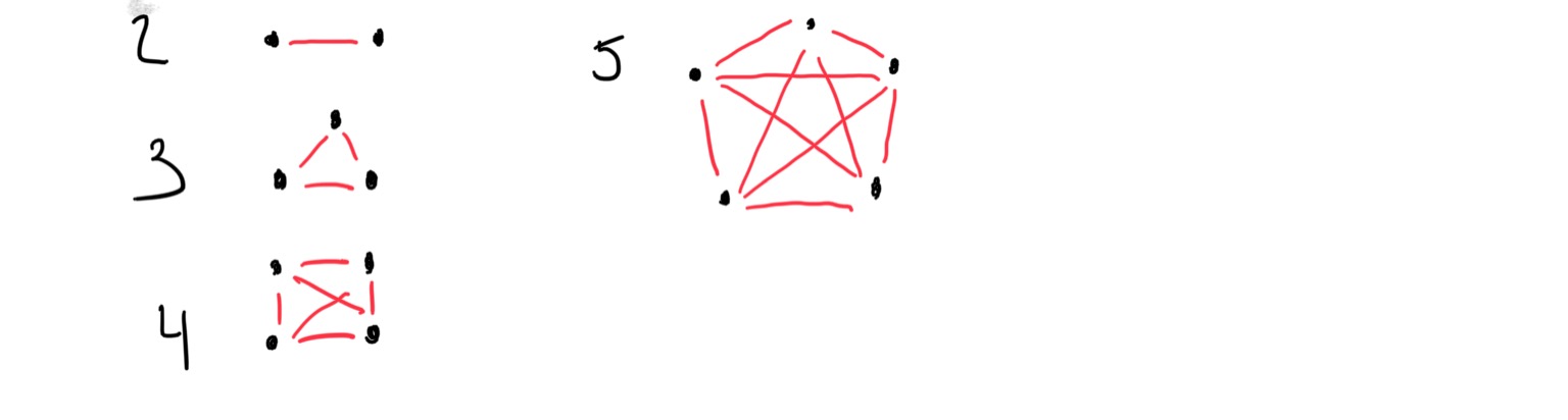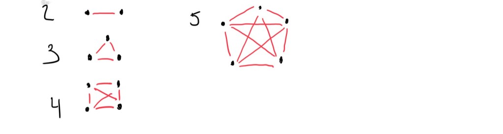 Like triangle numbers, it’s almost the same math! Rather than counting the dots, we want the connections. Rather than (n*(n+1))/2, the formula is (n*(n-1))/2.