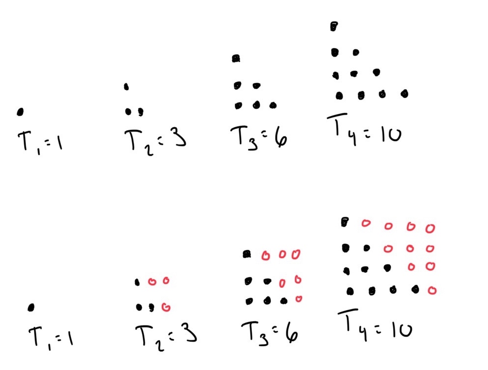 Doesn’t this feel like magic? The universe presents this little nugget (What is the sum of all the numbers from 10 to 1?) and rather than slog through we skip over. Reframing numbers into shapes changes our tool from addition to multiplication. Magical. We went from brute force to clever pairing to formulaic: (n*(n+1))/2.